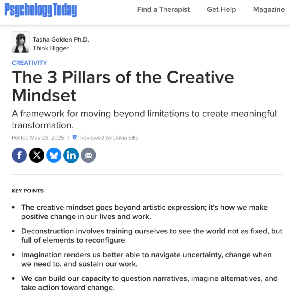 Curious how to begin developing a creative mindset in your life and work? My Psychology Today article dives into it: “The 3 Pillars of the Creative Mindset”.