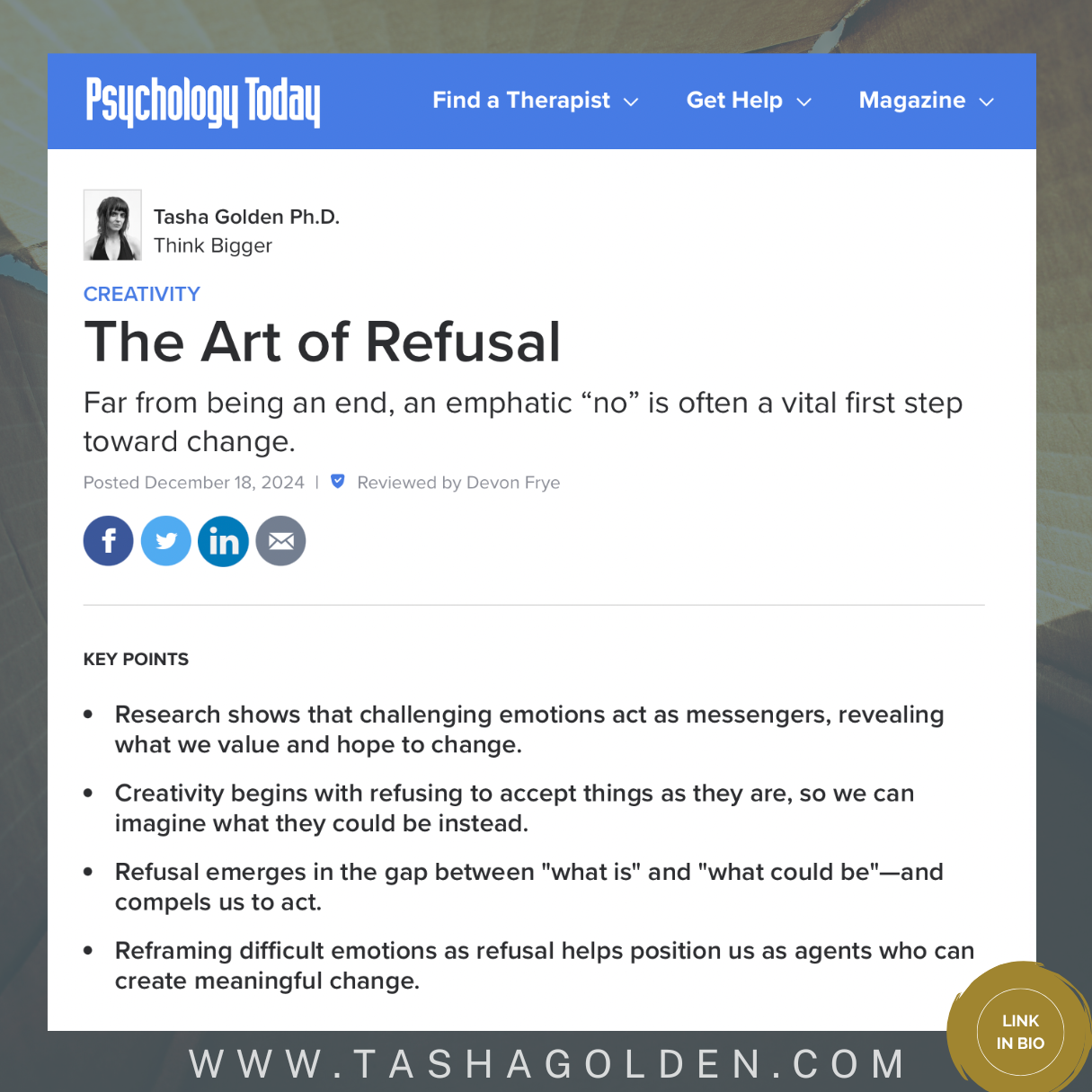 What if your most difficult emotions aren't obstacles — but the beginning of something? This Psychology Today article reframes challenging feelings as evidence of refusal: the force at the root of all creativity, change, and hope.